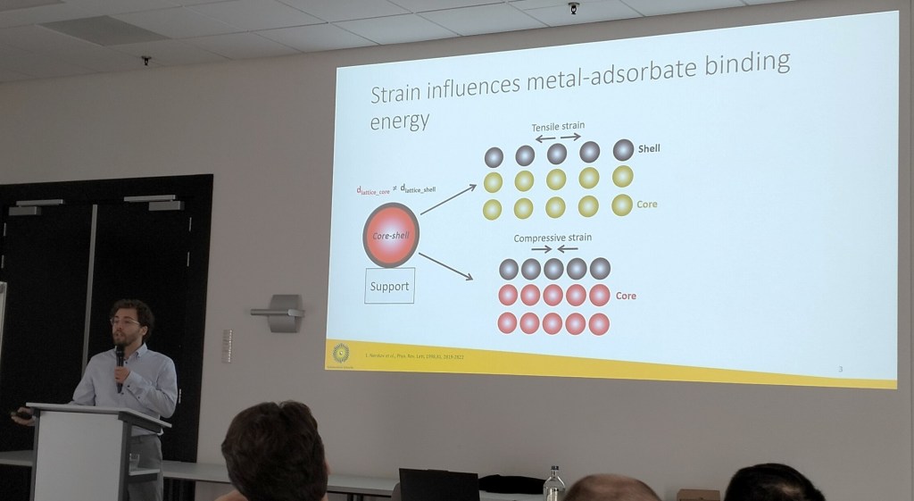 PhD candidate Just Pé Jonasse presented his work on strain-engineered gold/copper-platinum core-shell nanoparticles, including some exciting results for the effect of strain on the CO and H2 binding energy.