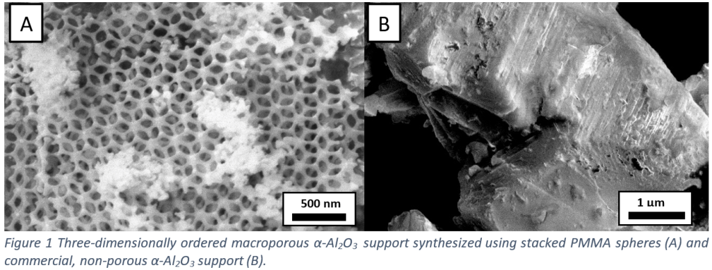 In this project we will explore new approaches to design and assemble high surface area metal oxide nanostructures, with high phase and surface purity. These serve as supports for model catalysts that will be tested in industrially relevant reactions to provide insight on the role of the support, which is useful to optimize existing catalysts. Examples of possible design routes for structured supports[1] are the use of replicas, sacrificial templates (such as stacked PMMA spheres[2], Figure 1A), or direct foaming techniques.