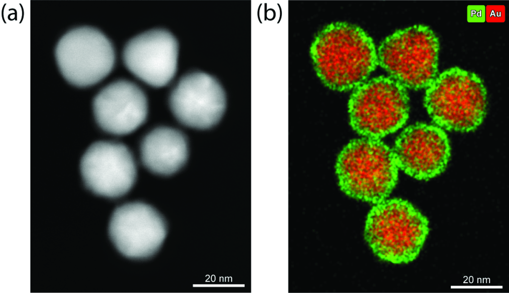 These kinds of studies will help us corroborate structure-function relations in bimetallic catalysts. For example Pd is known to segregate to the surface under an oxidative atmosphere, which increases hydrogenation activity since surface palladium is necessary for H2 dissociation [2]. Likewise, core shell structures in Au@Pd nanorods have been found to be more active in the butadiene selective hydrogenation than their monometallic counterparts, by having more Pd in the surface [3].